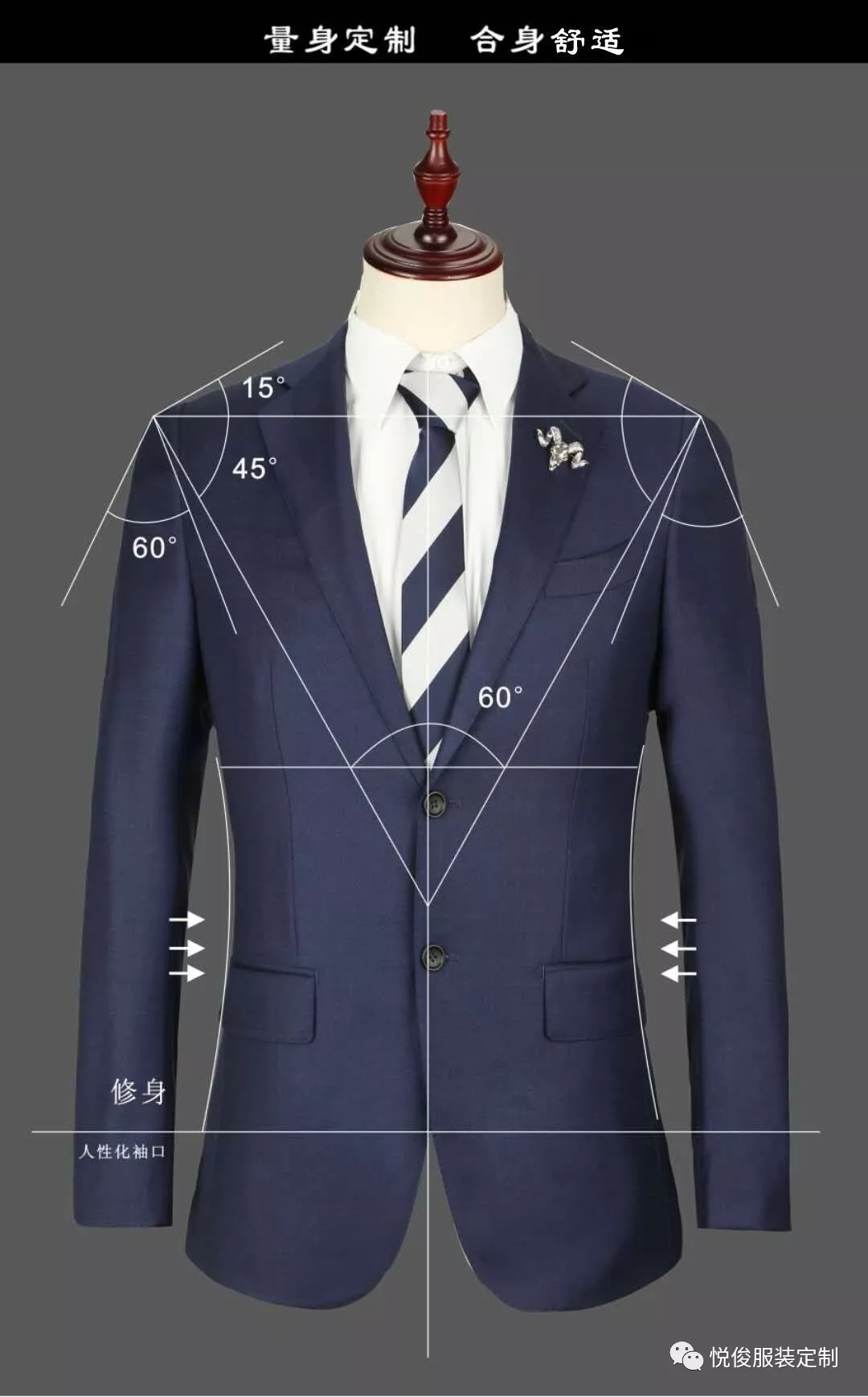 一般情况下,合身的西装上衣在解开纽扣敞开后与身体保持 3cm 左右的余量,系好扣后驳领要靠在胸上保证不隆起开炸